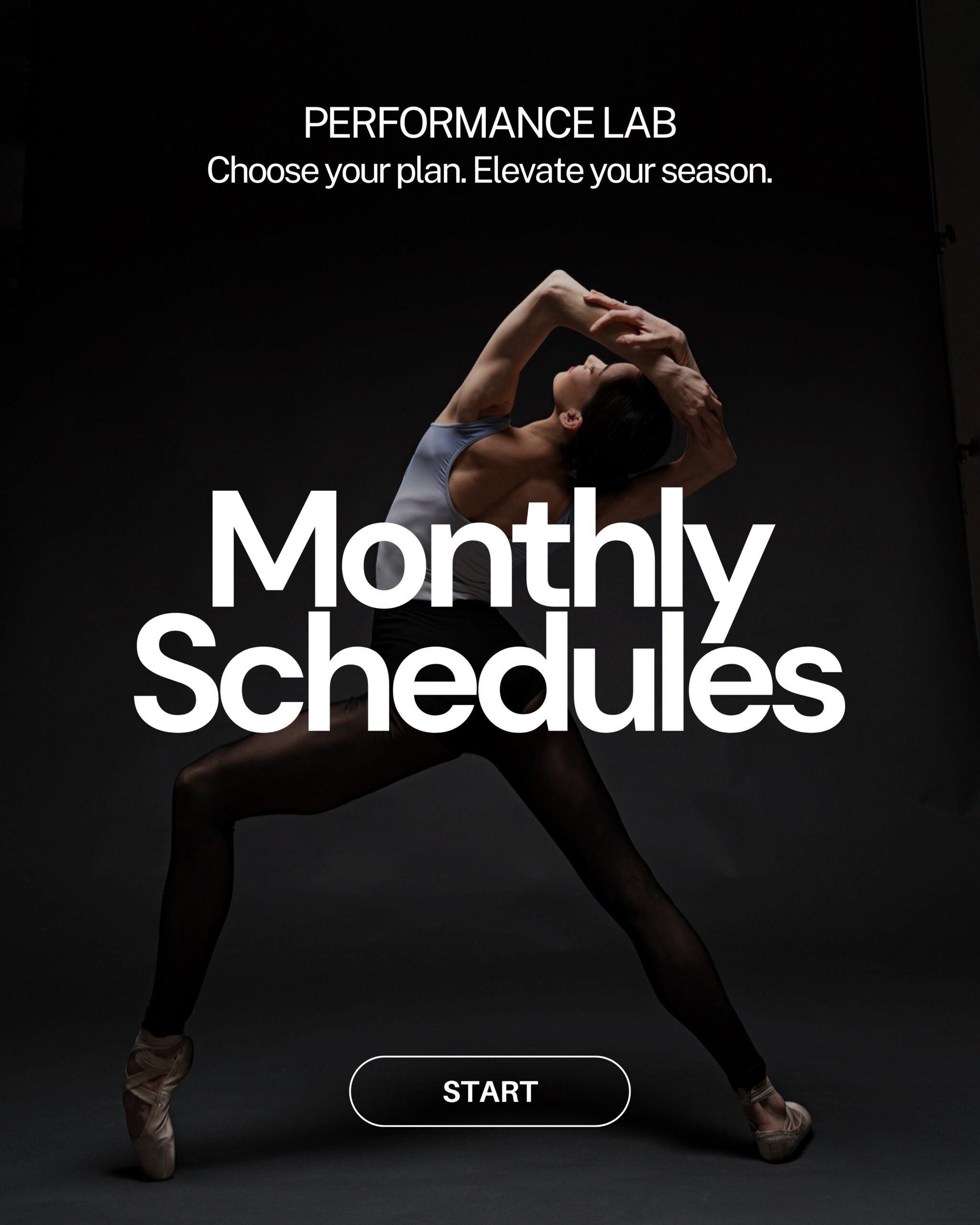 The Performance Lab is your advanced training home for dancers and athletes who want to strengthen technique, expand mobility, build power, improve coordination, and perform at their highest level. Designed through movement science, neuromechanics, fascia research, and ballet-informed conditioning, this Lab gives you both structured monthly programs and targeted focus areas — so you can train intelligently, avoid burnout, and elevate your performance with purpose.